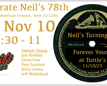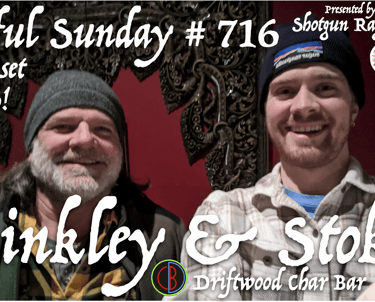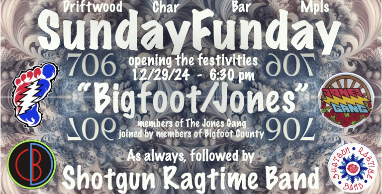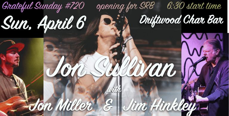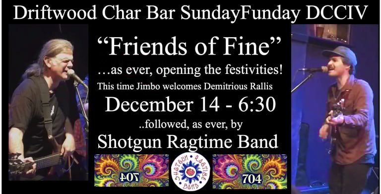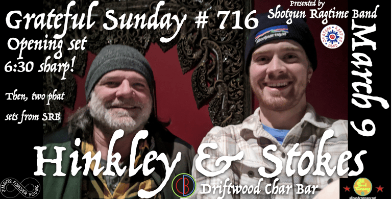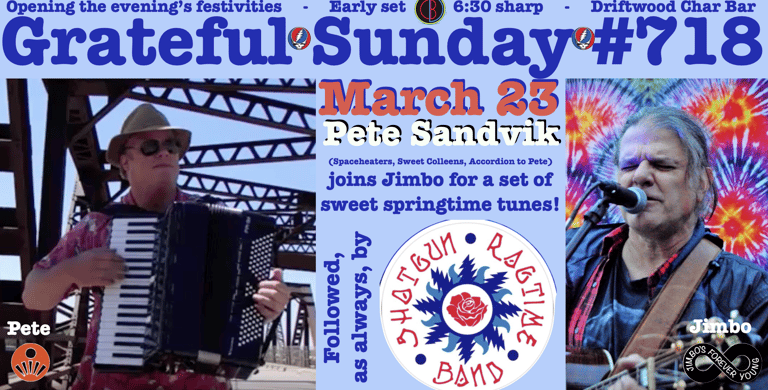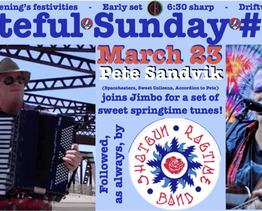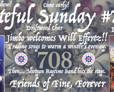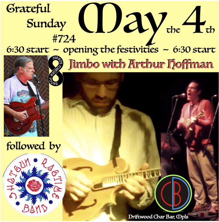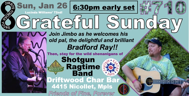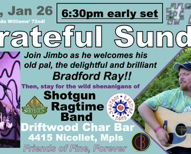 I haven't done a ton of writing, though when I was schoolteacher ('84-'18) I'd use all kinds of songs and raps in the classroom. But upon reaching my mid-sixties I've been trying to frequently work the undeveloped songwriting muscles. I have lots of fragments waiting to be patiently expanded or conjoined into unified wholes. I hereby endeavor to play at least one ideally new original "song" in every other week, in my "Grateful Sunday" sets. They happen every other week at the delightfully quirky Driftwood Char Bar, a south Minneapolis watering hole where Heidi the owner is an enduring supporter of live music. For that I'm forever grateful! I also have a ton of gratitude for Kevin Wick, founder/manager of the Driftwood's Grateful Sundays series, now approaching its 14th year of weekly Grateful Dead shows, brought to us by the Shotgun Ragtime Band. For years, I've had the good fortune to very frequently participate in the Grateful Sundays opening set, first with Eldon Hagen and Brian Green, then with Super Duty. During covid times things were slower and I sat out a lot but Kevin persisted, and kept up his coordination efforts, guided by the selfless belief that every decent music-town needs a regular home for Grateful Dead music and culture. Since the shocking 2024 passage of Minneapolis Drummer-extraordinaire and longtime collaborator Steve Fine I've taken up the task presenting the opening set, during the "even" weeks (710, 712, 714, etc). So really, that's my main regular gig, and I love it. I get to dip into my treasure trove of local musician-friends that I've made over the decades. Mainly we play duos. Look below for a sampling of promo fliers I've made to alert folks to the luminous guests I've had.